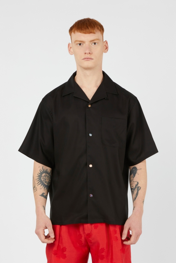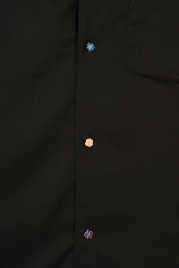 AN AMERICAN TYPICAL CAMP SHIRT SHAPE BUT NICE AND WIDE WITH 5 BUTTONS THE CLASSIC WAY. MADE IN A BLACK SPUN RAYON, USING GIOIELLE BUTTONS IN MIXED COLORS, ALL IN A HIBISCUS SHAPE IN SILVER AND GOLD TONES WITH VARIOUS ENAMEL COLORS.